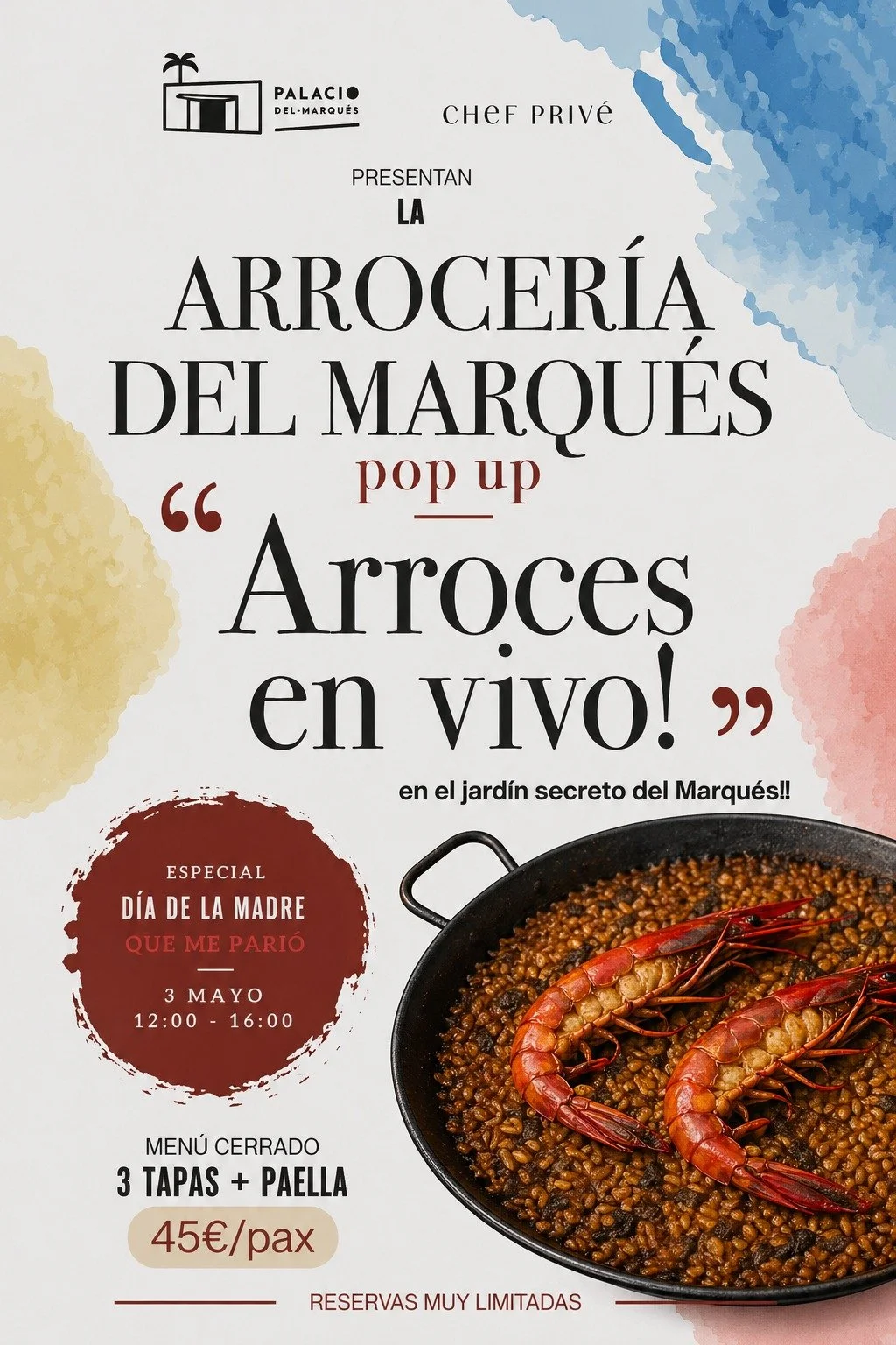 ❋ ¿Que ofreceremos?Para esta ocasión especial hemos preparado un menú cerrado compuesto por 3 tapas + paella cocinada en vivo, diseñado para compartir, disfrutar y celebrar como merece una fecha tan señalada.